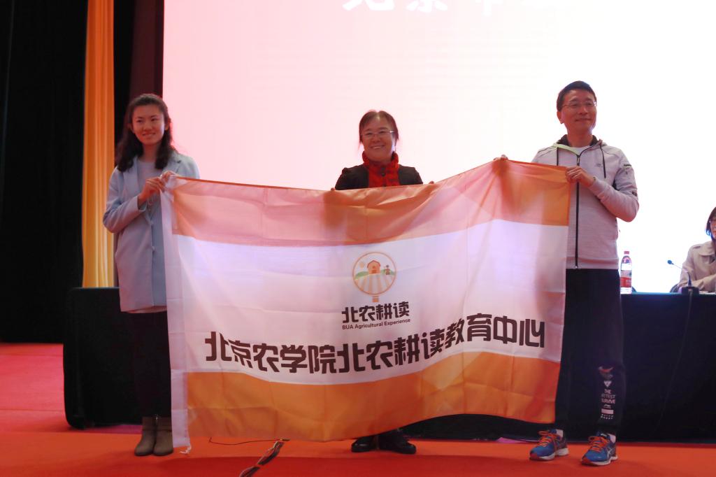 伟德国际VICTOR1946为北京景山公司远洋分校校授旗,同时,伟德国际VICTOR1946北农耕读教育中心主管陈学珍教授为学农班授牌。