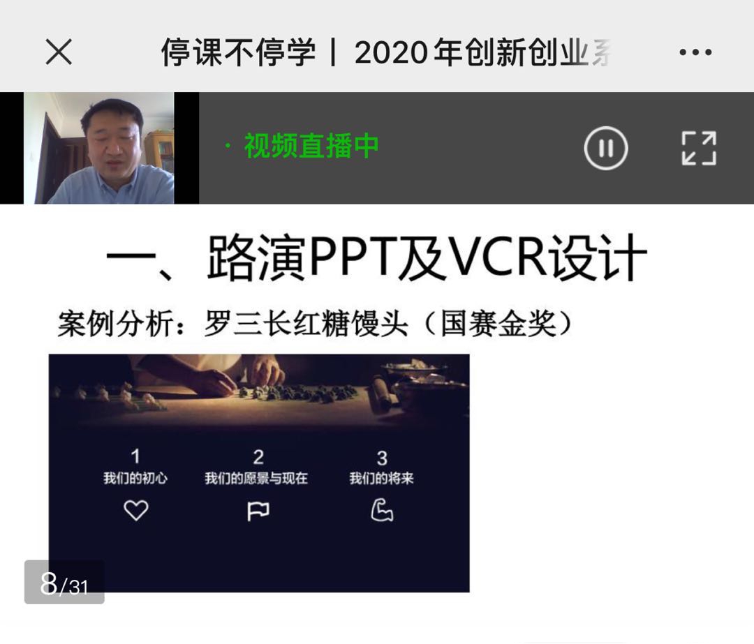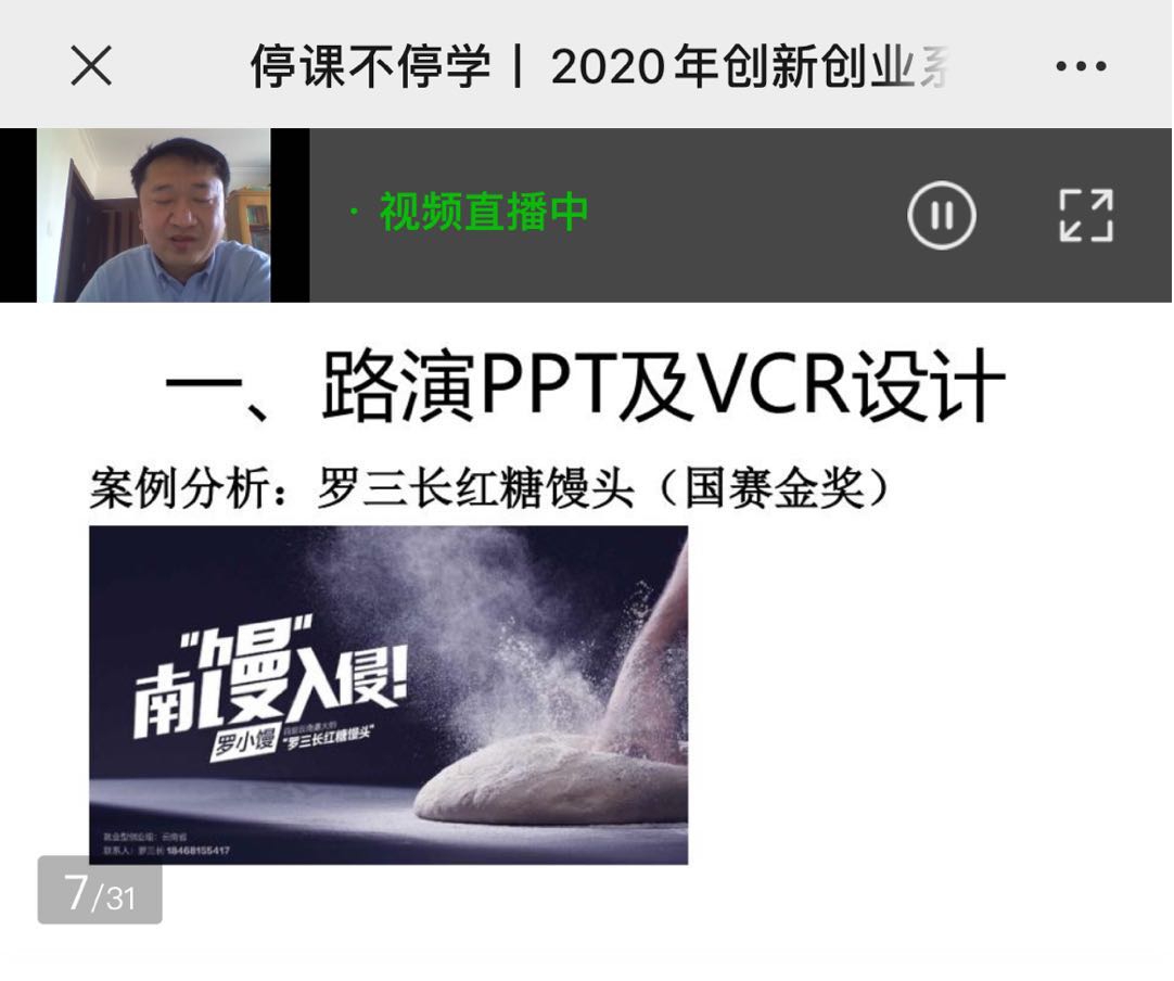 本次课程中,韩晨光老师通过“路演PPT与VCR设计”、“路演的基本礼仪与应答”、“评委互动基本原则与常见错误”三大模块为同学们系统讲授。首先,韩晨光老师以国赛金奖“罗三长红糖馒头”项目为例,给同学们形象具体的讲述了“罗三长红糖馒头”项目路演PPT是如何从一份毫无特色的PPT变为一份赏心悦目、为项目加分的PPT,他们在总决赛前十几分钟还在不断修正自己的PPT,正是这份坚持,造就了如今又上百家加盟店的“罗小馒”。韩晨光老师深度剖析了一份优秀的路演PPT 应该包含的要素和内容。随后老师又对路演礼仪、互动原则为同学们进行了讲述,使同学们受益匪浅。相信每一位观看直播的同学,都会带着这一份收获,不断去优化自己的项目。