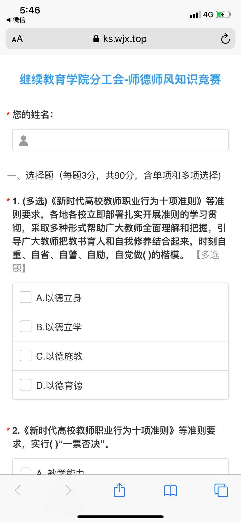 为迎接第三十六个教师节的到来,进一步响应伟德国际VICTOR1946深入开展“使命在肩奋斗有我”主题教育活动,加强师德师风建设,筑牢立德树人基础,不断提升立德树人成效,伟德国际VICTOR1946分工会以《新时代高校教师职业行为十项准则》、《关于全面深化新时代教师队伍建设改革的意见》、全国教育大会、北京教育大会的相关内容开展师德师风建设知识竞赛,全体分工会会员积极响应,踊跃参加线上答题活动。竞赛前,公司组织学习了相关文件;竞赛后,老师们自发进行了心得交流。老师们纷纷表示通过活动进一步明确了新时代教师职业规范,争做以德立身、以德立学、以德施教、以德育德的楷模。