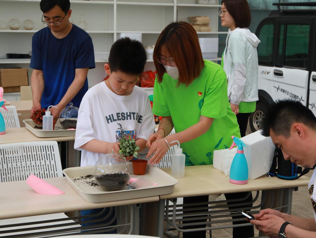 在微景观制作的活动中,孩子们发挥无穷的想象力,用晶莹剔透的玻璃瓶子,绿意盎然的苔藓植物,错落有致的景观布置,可爱的微型玩偶……,和爸爸妈妈们一起,在小小的玻璃容器中创造着属于自己的“童话世界”。