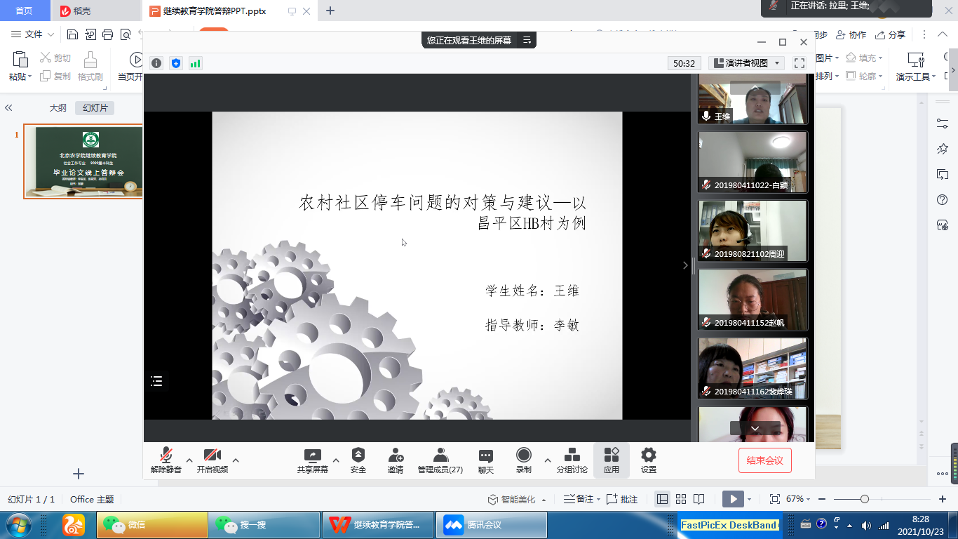 2019级成人高等教育本科生毕业论文线上答辩采用腾讯会议平台进行,共有动物医学、园林、社会工作三个专业、五个答辩小组的110名本科生参加本次论文答辩工作。通过在线视频共享、PPT汇报和视频问答等方式,实现师生无障碍沟通和交流。答辩工作在严谨、有序的环境中进行,参加答辩的员工准备充分,材料组织详实,答辩会场严肃认真。