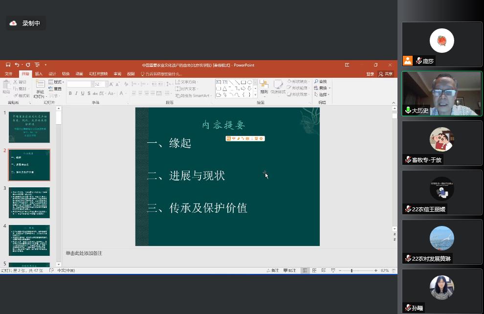 创新创业公司邀请到中国农业博物馆研究馆员、农业部全球重要农业文化遗产专家委员会委员,中国重要农业文化遗产专家委员会委员徐旺生老师为公司师生带来题为“中国重要农业文化遗产的由来、现状及其传承保护价值”的精彩讲座。徐老师从中国重要农业文化遗产的起缘、进展及发展现状为同学们做了详细讲解,并进一步讲述了农业文化遗产同其他一般意义的自然或文化遗产之间的具大区别,以及农业文化遗产对人类文明的独特价值和重大意义,科学阐释了农业文化遗产保护的方法与路径,并强调农业文化遗产必须坚持“在发掘中保护、在利用中传承”,这对农业可持续发展具有重要意义。本次讲座共有253人次观看学习。